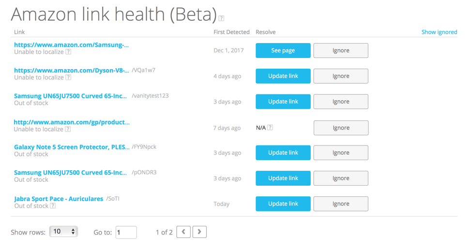 With the Geniuslink platform, we’ve built in a link health report and provide an easy way to update affiliate links that are no longer working, recognized by Amazon’s Product Advertising API, or are for products that have gone out of stock. There are other third-party tools available as well, though most seem quite expensive for the limited service they provide.
